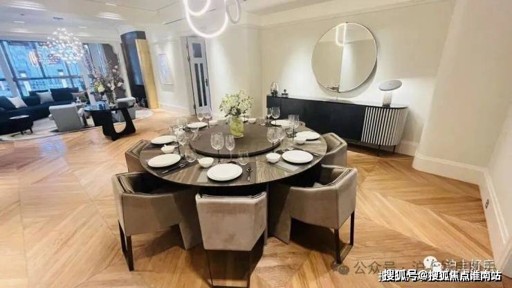 地面通铺浅灰色的仿大理石瓷砖,与吊顶的大灯池形成鲜明对比,加上一个大吊灯,氛围感满满。