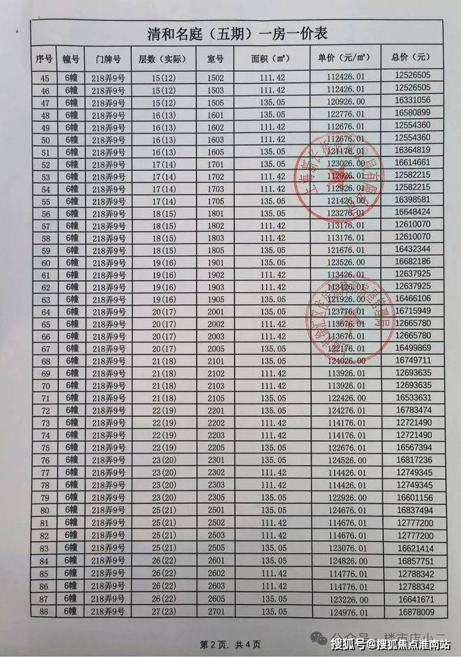 前期一房一价表公示 :