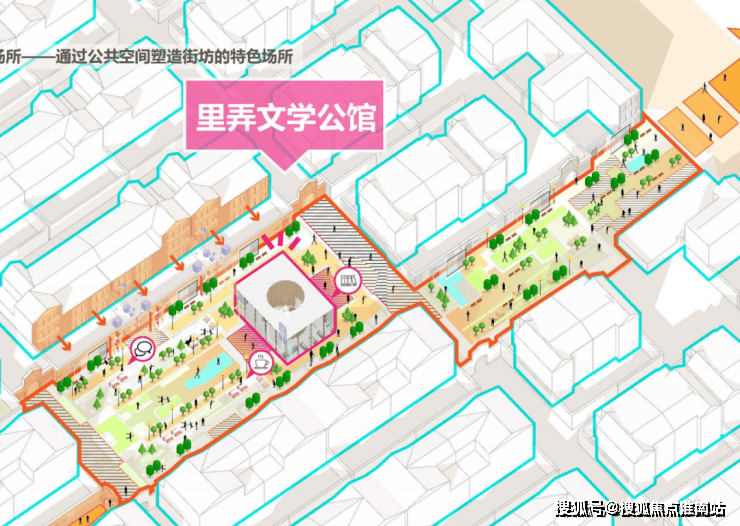 在这条文化通廊上,设计一个通透的文学公馆。可以作为住区居民交流休闲的特色公馆,衔接内部南北里的交互空间。也可以作为承接东西建筑功能的过渡空间。
