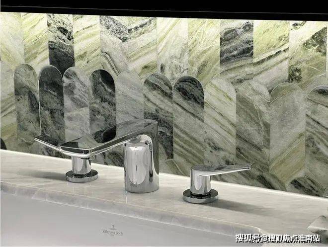 基础硬件都不差,项目在审美上还做了不少创新——卫生间大量采用奢石和石材,比如主卫柜体墙面就是香格里拉翡翠拼花,龙头是冷热分离式,成本更高:
