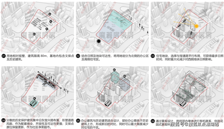 项目地块形状为不规则梯行,南北方向较长,将用地分成南北两部分,其中北侧布置商办组团及历史建筑,南侧布置住宅组团及综合配套(文保点)。