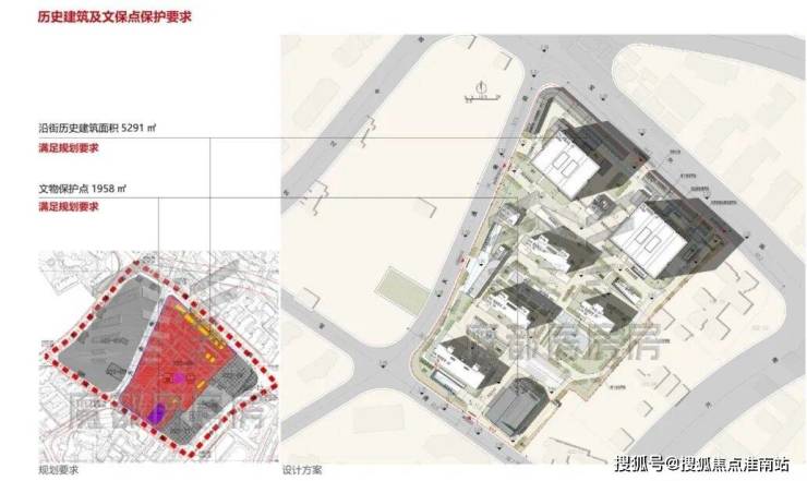 基地内需设置两栋办公楼、三栋商品住宅、一栋租赁住宅,此外基地内含5291平方米历史建筑,功能为配套商业及文化设施,含1958平方米文保点,功能为净菜超市及文化设置。