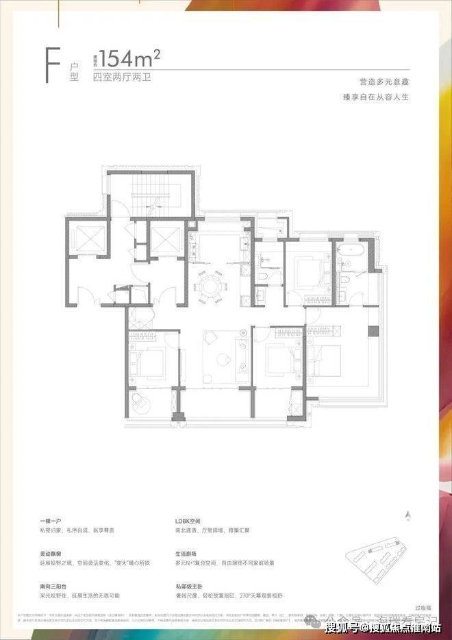 建面约154㎡四房户型:四面宽,南向总面宽约14.2米,客厅面宽约4.3米,进深约7米,客餐厨阳台一体化,主卧面宽约3.8米。三阳台(交付后不破坏外立面可以自行打通改造)、主卧大转角飘。