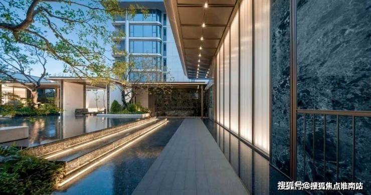 穿过归家大堂,入眼的便是大片的镜面摩登水院,涌泉叠水,高低错落、动静相宜。 景观 设计团队更是在水院里做了一个下沉式卡座,未来业主可以在这里闲坐观景,与三五好友可以畅聊天地。