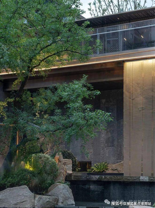 三进庭院雨打芭蕉,檐语时光。四进沉浸式下沉式会所以高山流水为幕,通过层叠水景与立体山石,复现《溪山行旅图》觅得知音的沉浸场景。