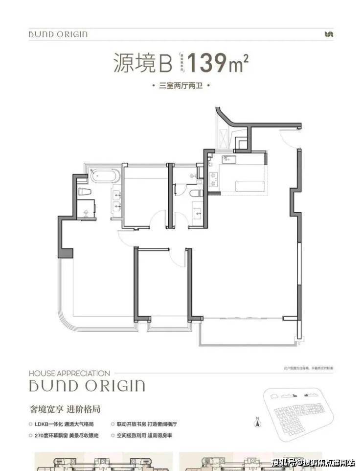 B户型是3房2厅2卫格局,三开间朝南+LDKB一体化+奢阔宽厅+全卧室带飘窗+主卧套房设计+动静分离+主卧270度飘窗,舒适度更高.外滩源著复兴里售楼处电话:400-9966-224