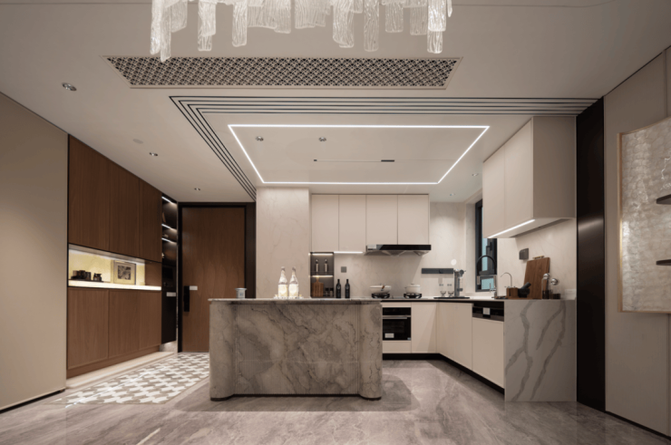 走进海上·清和玺的厨房, 墙面岩板通铺 ,视觉效果超棒。