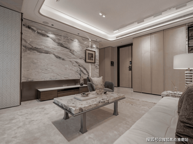 100㎡A户型,入户玄关透光「雪山银狐」奢石,让人惊鸿一瞥,如置身纯净广袤的自然雪域,净澈本心;客厅背景墙「幻日流光」岩板,质感细腻,如大地流沙,阳光洒在上面,更折射出璀璨柔和流光。室内大面积影木木饰面,更与灵石相互协奏,平衡出空间的温润静奢格调。