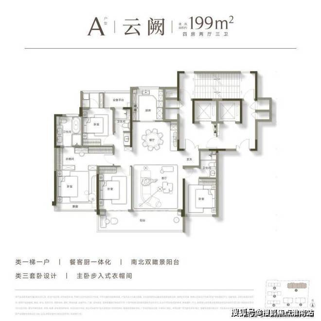 杭州建发英冠宸云售楼处电话:400-881-8994(售楼处最新电话)即将首开的建面约199㎡A户型,做到了类一梯一户设计,可实现“电梯厅玄关化”,私密感满分。