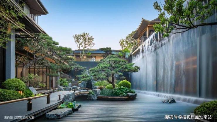 但真正将大院深宅感推向顶峰的,是它的“禅境四重门”。从前院穿过装饰垂花柱的将军门,是栽植乌桕、罗汉松等名贵树种的“叠翠禅院”。院中溪水潺缓,如入清凉境,让人心生欢喜。门后是烟雾迷蒙的水院,一座五折连桥涉水而过,通向镂刻祥云纹的电动门——门后则是云城之上的三进空间“山水雅庭”。