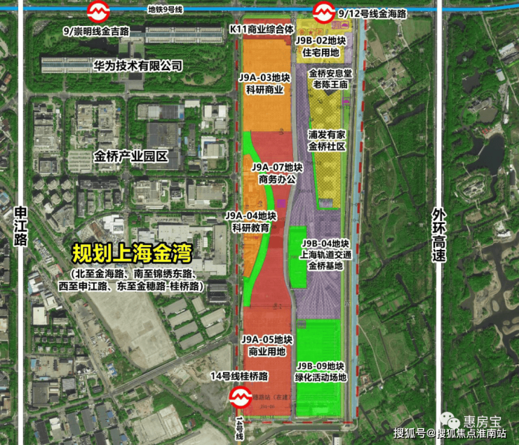 整个项目东至赣桥路(外环运河),南至桂桥路,西至金穗路,北至金海路,项目西侧就是由金桥集团开发的上海金湾!J9A-02地块:9、12号线地铁上盖,东侧是住宅部分,西侧是华为研发中心。该地块地上拟建设商业、酒店及酒店物业用房,其中,商业部分地上建筑面积36489.24㎡,酒店部分地上建筑面积20956.16㎡。