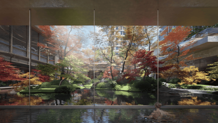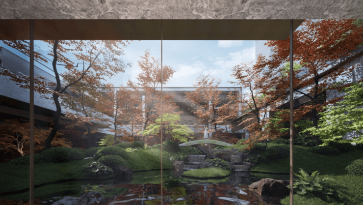 近1000㎡下沉庭院,取法名园造景精髓,精选乌桕、紫薇等古树名木,复刻苏式园林风貌