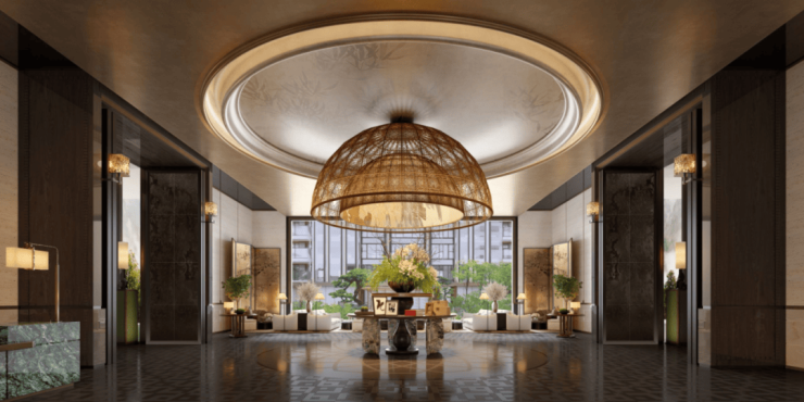 9️⃣四进归家,门庭礼序:首入约88米地标门厅,以苏州首座大尺度流光宝顶与铂金长屏,营造酒店式落客体验。再经约500㎡归家门庭,双瀑环抱,顺风顺水。穿越会所,经由两大归家花园与架空花园步入家门,层层递进,彰显门第尊荣。