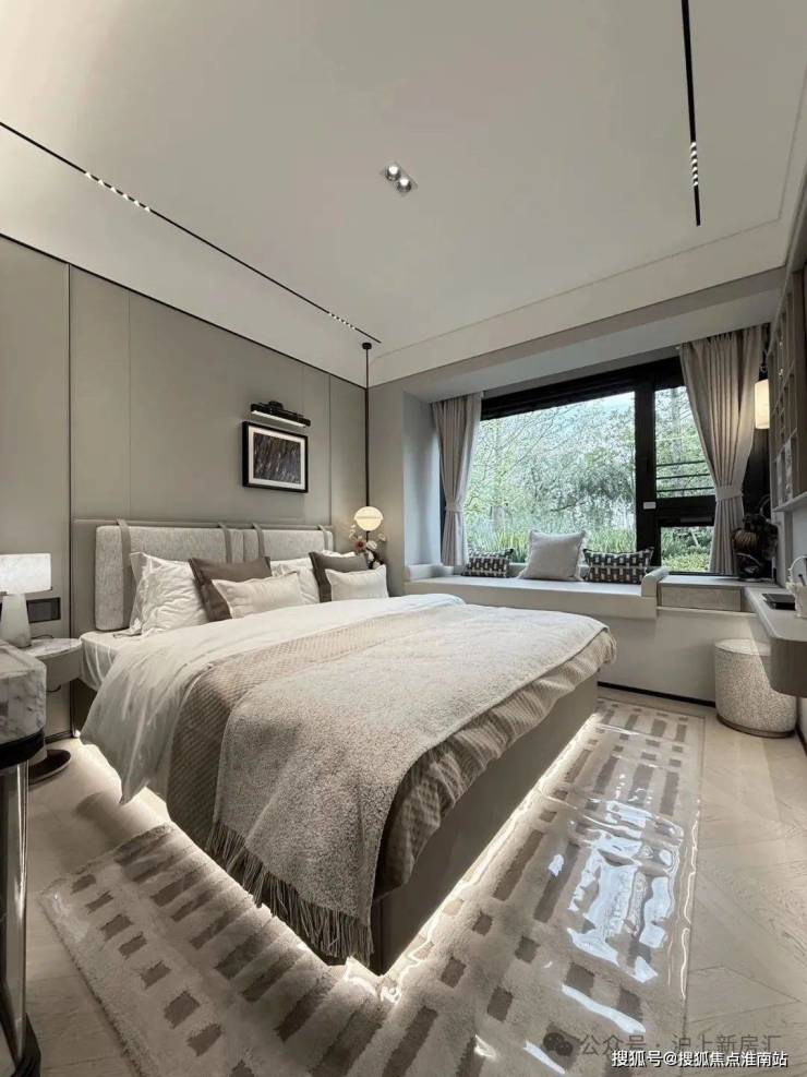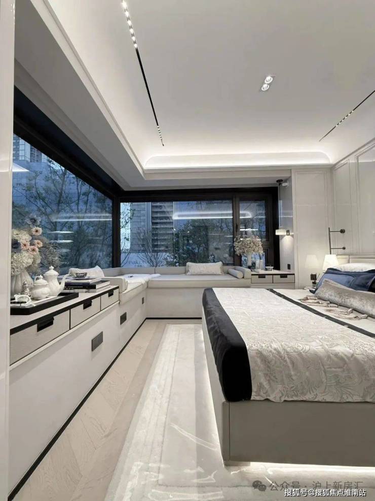 其中主卧的270°转角飘窗就有约5.7m²,通过与外立面的结合,直接做了梳妆台和储物柜,拓展了飘窗的实用性。