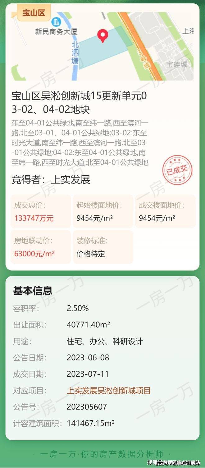2023年7月11日,上海第二批次2轮土拍中,上实以总价133747万元成交宝山区吴淞创新城15更新单元03-02、04-02地块,地块出让面积40771.4㎡,容积率03-02:2.5;04-02:4.0。溢价率0%,楼板价9454元/㎡,房地联动价63000元/㎡。