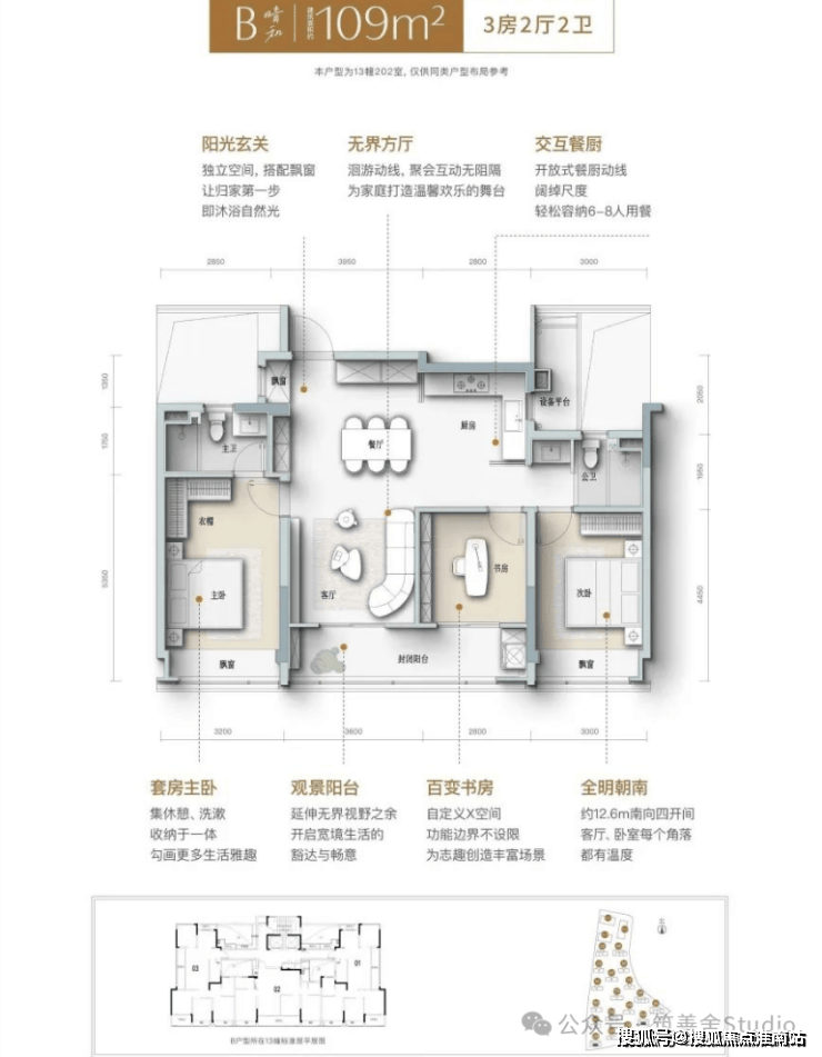 建筑面积109㎡户型,阳光引航玄关,独立空间巧配飘窗,入门即享温暖阳光的拥抱。无界客厅,流畅洄游动线,畅享无间互动,打造家的温馨欢乐场。约12.6米南向四开间,客厅卧室每个角落充满温馨。互动式餐厨,开放式空间容纳6-8人,共聚温馨时刻。观景阳台,拓宽视野,开启无限生活境界。