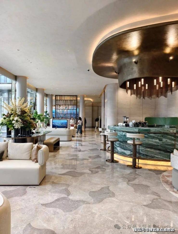 主入口大门以其宏伟的尺度彰显端庄与大气,高达7米的门庭让人瞬间感受到尊贵的气息。此门庭选用贝金米黄石材、维多利亚绿与白雪公主奢石,搭配古铜色金属板,巧妙融合冷暖色调,营造出极具张力的美学效果,开启都市奢华新境界。每一细节都透露出非凡的贵气。圆形镂空穹顶之下,一株近7米高的紫薇树卓然而立,阳光倾泻而下时,尽显“紫气东来”的祥瑞意韵。