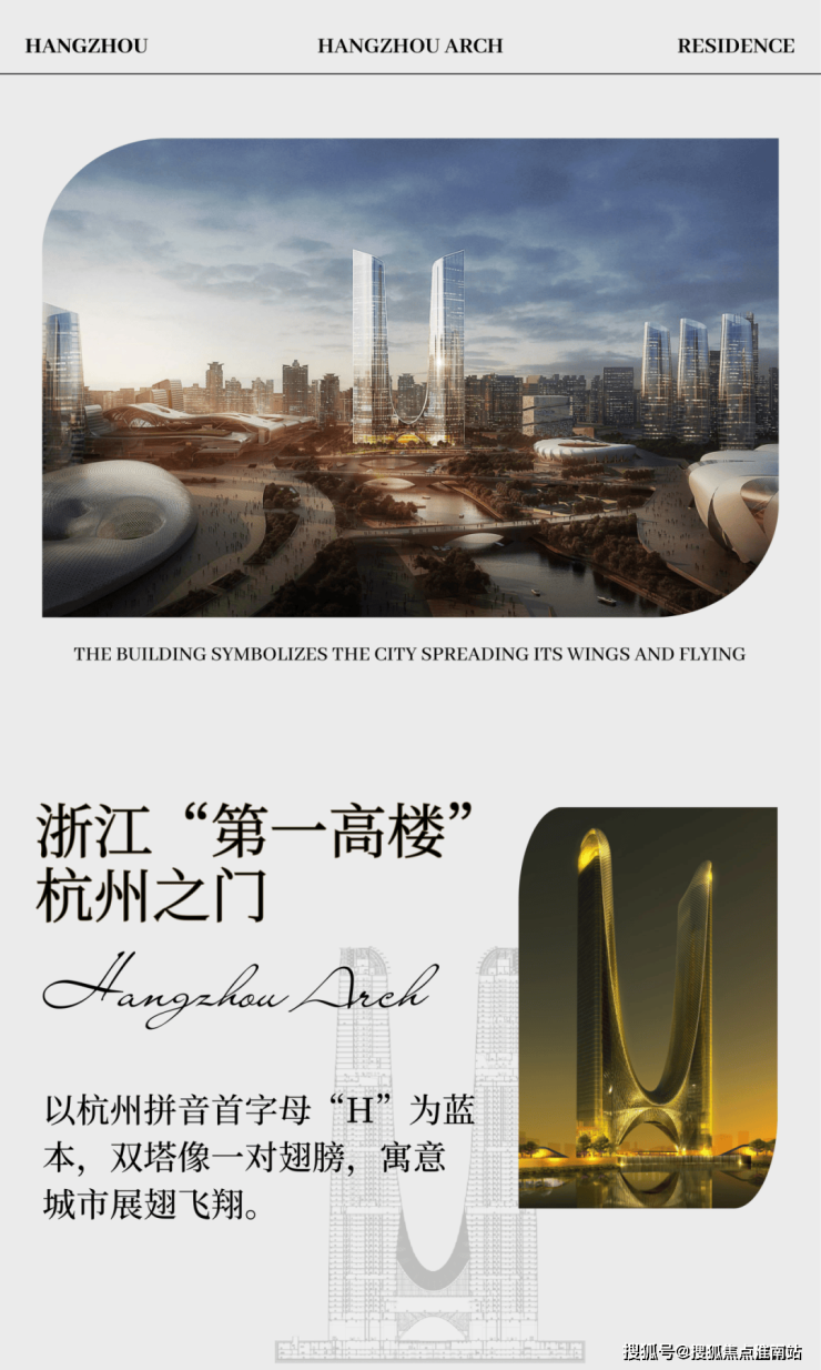 建筑风格:以杭州拼音首字母“H”为设计蓝本,并巧妙融入“拱宸桥”元素,双塔之间设有主跨度约62米、高约34米、宽约58米的拱形钢连桥,整体造型既彰显现代时尚感,又蕴含深厚的地域文化特色。