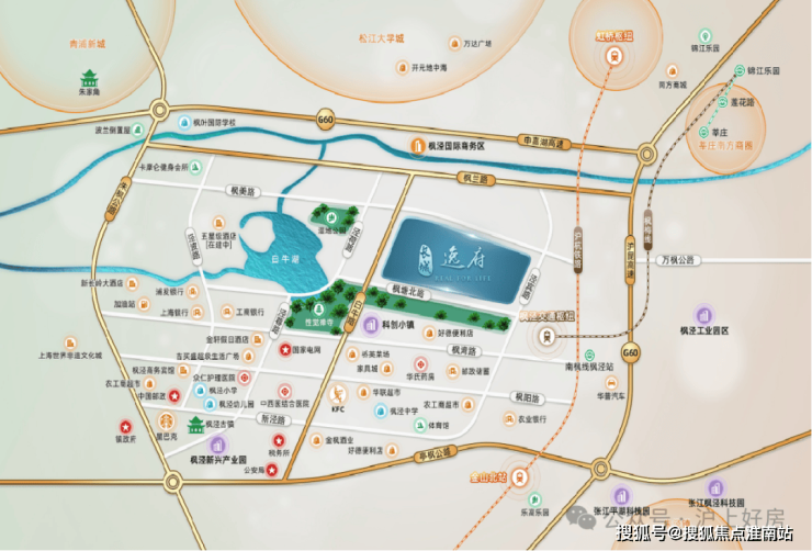 商业方面,项目南面约500米处有枫湾路菜市场及盒马超市;南面约800米处有肯德基、联华超市、农⼯商超市等配套。项目旁边在建的五星级劲霸枫泾酒店,这将是金山第一个五星级酒店。