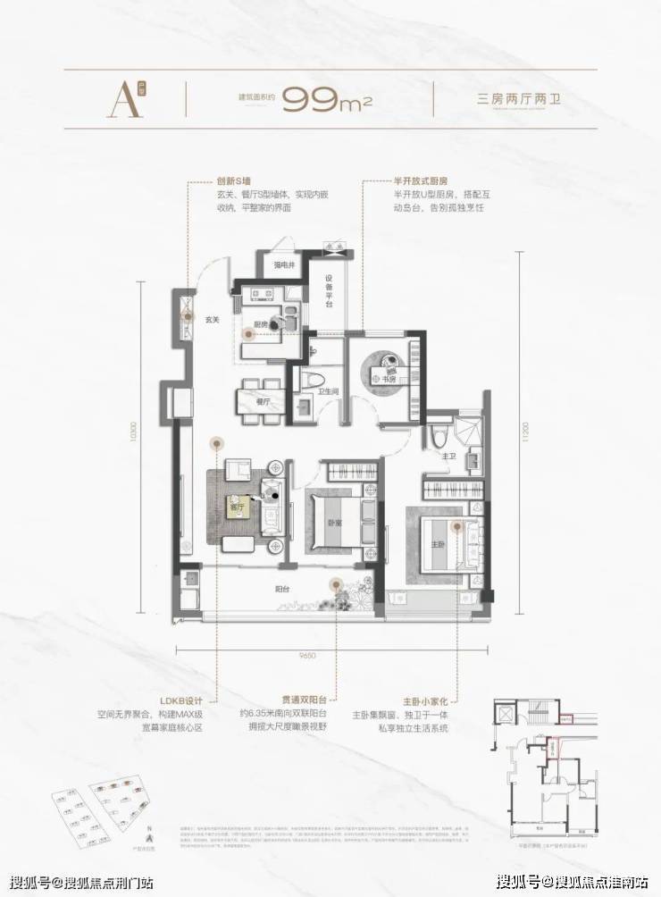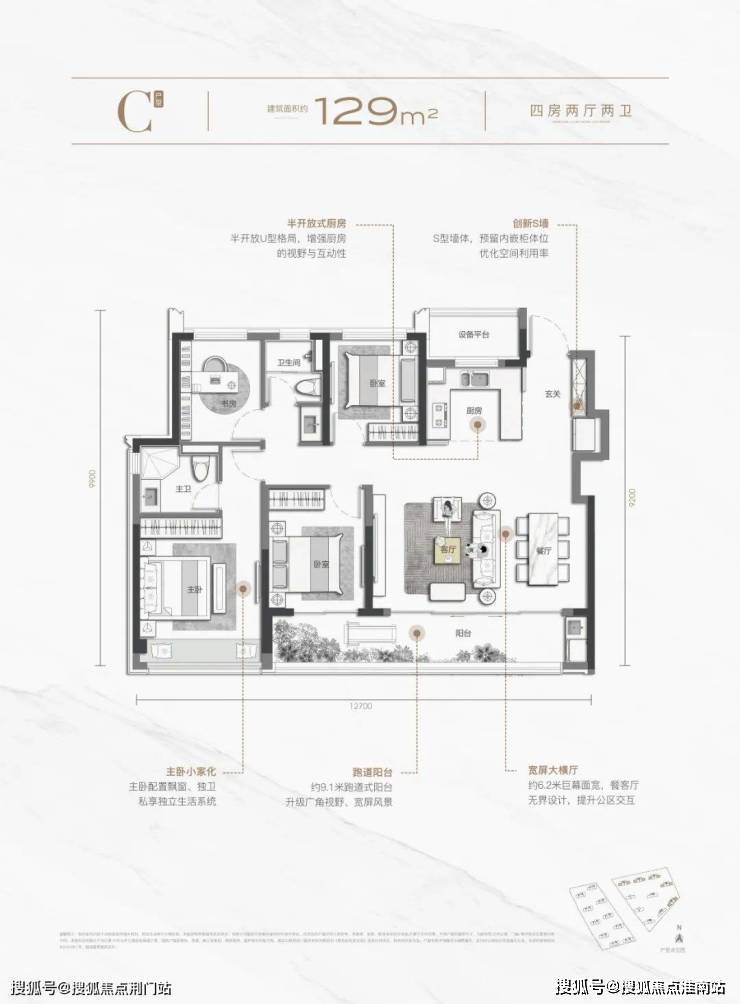 建面约129平方米四房两卫和99平方米三房两卫的户型,也都各有亮点。前者具有宽屏大横厅和约9.1米跑道阳台,后者也具有约6.35米的起步双联阳台,视野开阔。
