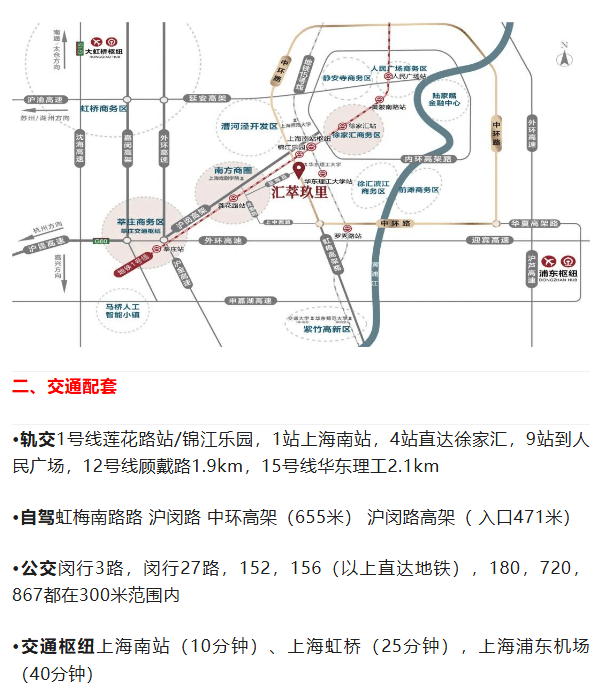 汇萃玖里坐落闵行与徐汇区主城的交界的黄金中环地带,中环上中西路下匝口,虹梅南路与益梅路交汇处、东至虹梅南路(中环高架)、南至北潮港、北至益梅路。