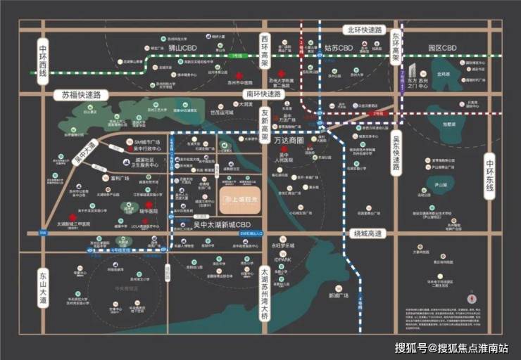 苏州太湖新城医院(建设中):距离项目4公里左右。苏州太湖新城医院为公立医院,计划将建设以市立医院东区为班底的三甲级太湖新城医院。总占地面积8.2方方,总建筑面积约 27.2万方,总投资约27亿元。医院委托国际知名的医疗机构管理,建成后将为周边的市民提供先进的医疗和人性化的服务体验,预设置床位1000 张。