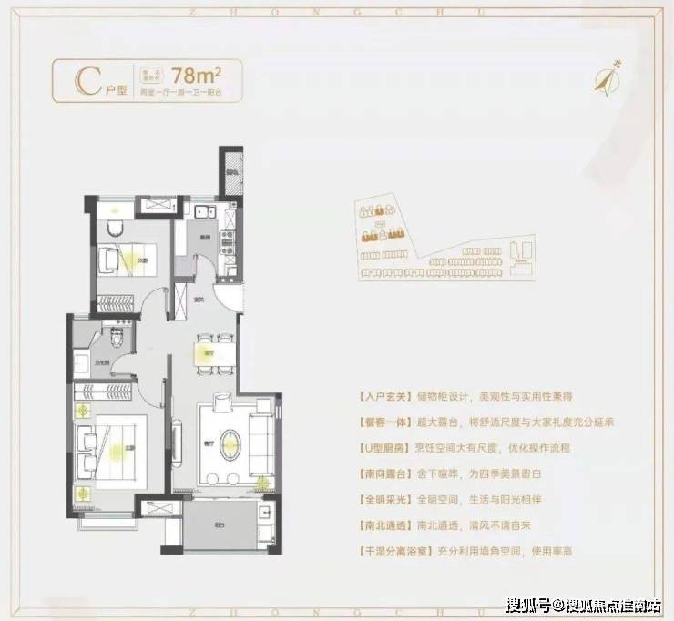建面约78㎡2房1卫户型,做到了双开间朝南+南北通透+卧室带飘窗+动静分离,功能区划分、动线都非常清晰。
