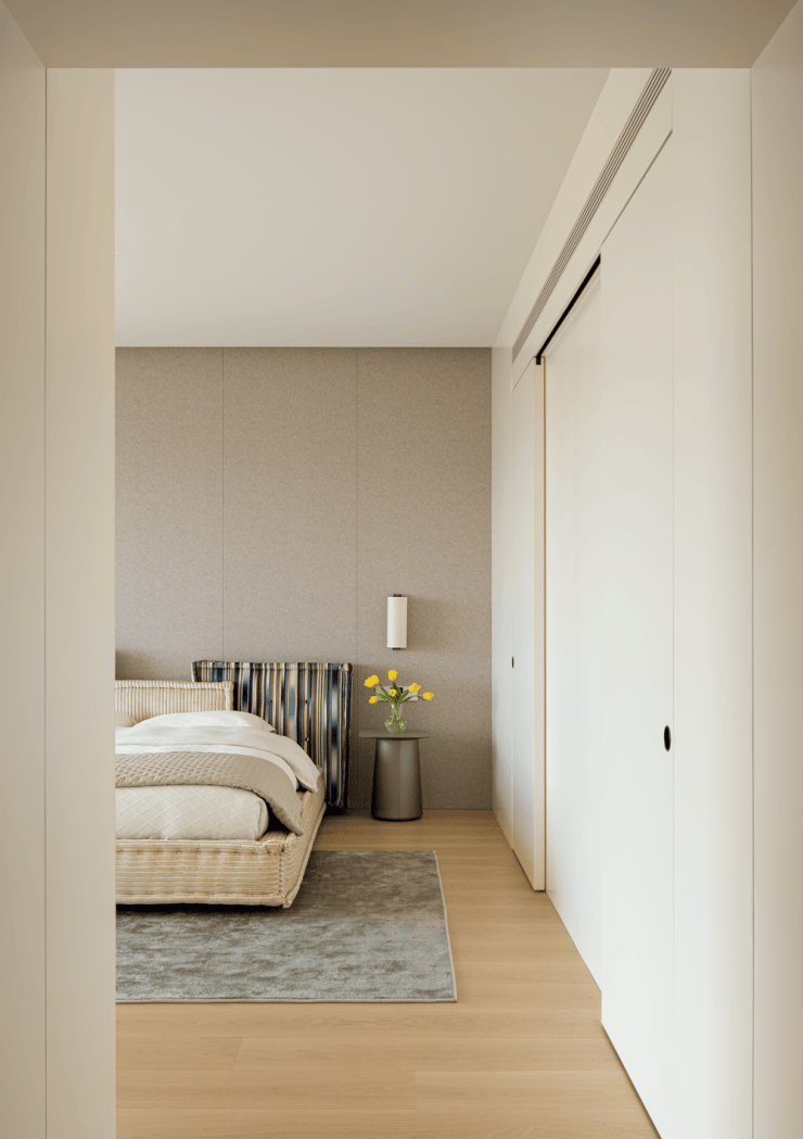 作为入户第一幕,玄关以极简姿态开启生活叙事,素净墙面如天然画布。清透支架托举着素白花瓶,植物姿态俏皮延展,成为连接户外与生活的温柔过渡。