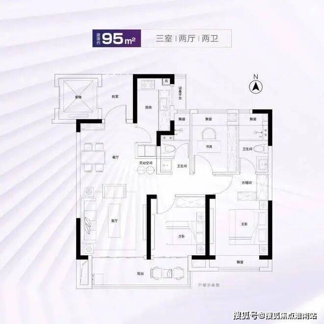建面约95、96㎡室内拥有双开间大尺度阳台、全屋四处飘窗、套房式主卧,舒适度颇高。
