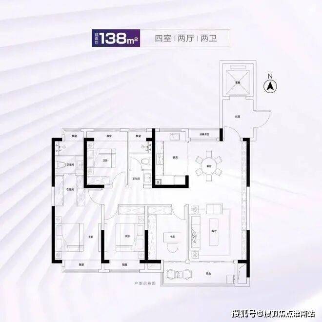 四开间朝南的建面约138㎡4房2卫,可满足大家庭一步到位需求。