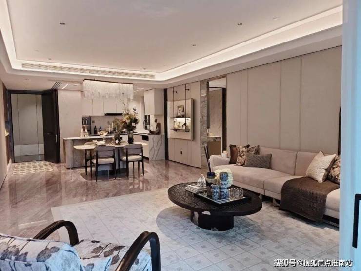 6、社区含“奢材”量很高。门庭延街的外立面,以精工定制弧形米色石材为主调,镶嵌典藏级老虎玉大理石,点缀古铜色现代海派艺术感灯器,整体呈现出百年海派的贵雅气质。