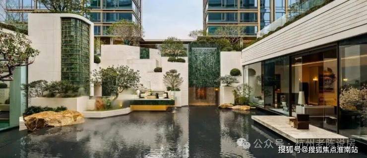 走近沐芳洲,首先映入眼帘的不是冰冷的大门,而是一座长卷般的艺术前场。设计师在这里奢侈地造了一个宽约150米、纵深约36米的超级水院。