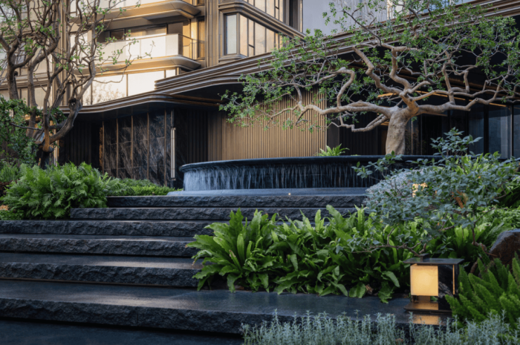 金茂·璞元的社区景观,自然是卓尔不凡,整体抬高约1.4米,以“三境九韵”营造城市中的“山林溪谷”。