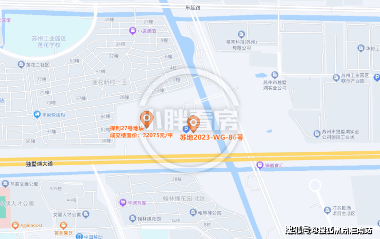 北面是住宅小区莲花新村,东面河流,南面是独墅湖大道,隔河就是住宅小区翰林缘,西面则是在建的保利珺华赋。