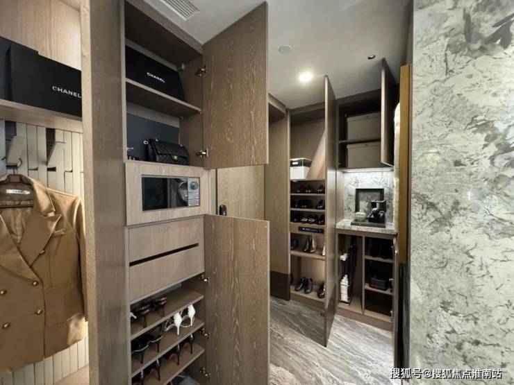 进门后玄关处左右手都有通顶玄关柜,内置鞋柜精灵,可以看到玄关内部的隔板也是高度不一,普通鞋子、高筒靴、雨伞架等等,都有分区。