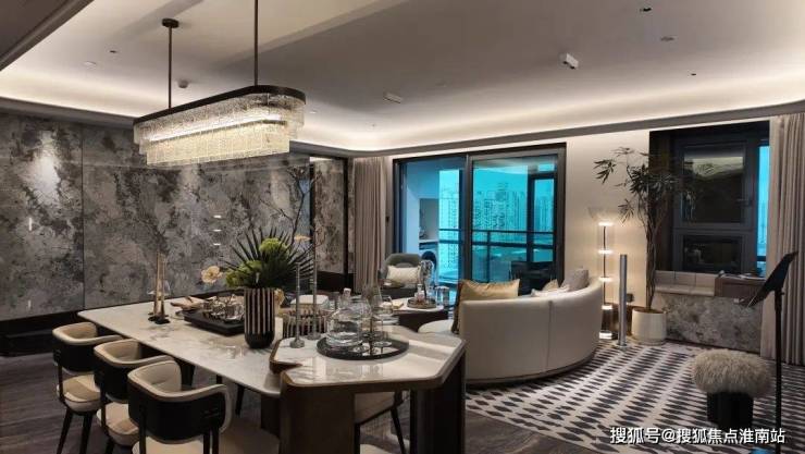 样板间是做了横厅设计,实际交付为4房,这个 横厅连同书房面宽约6.9米,仅客厅面宽约为4.2米;电视机背景墙是雪山蓝岩板,也是交付的;室内地面的材质铺装选用1.8米*90公分的大砖密拼而成,几乎看不到缝隙;包含阳台移门在内,所有窗户均为三玻两腔。