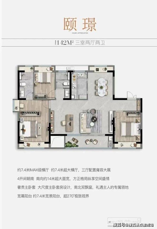 户型点评:百平左右的户型打造三室很常见,但能同时做到南向3.5开间属实难得;餐客横厅更是达到了约5.1米的宽度设计,大幅提升了生活舒适度、以及实用性;主卧套房,涵盖步入式衣帽间与独立卫浴,✅✅中建颐璟台售楼处电话:400-8567-004✅✅南向自带飘窗,缔造尊贵私密私享。