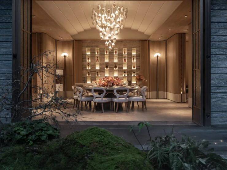 约60米的超长门头,一眼震撼。门前静卧着价值百万的160岁罗汉松,两侧屹立着自山东泰安精选的百年油松、还将“泰山”般的太行金石雕与贵族玉石“白雪公主”融入场景,低调奢华造就高级审美。