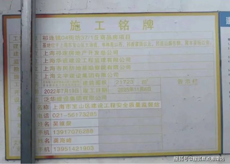 施工铭牌显示,该项目竣工日期为2025年11月,建设单位为上海祁连房地产开发总公司。
