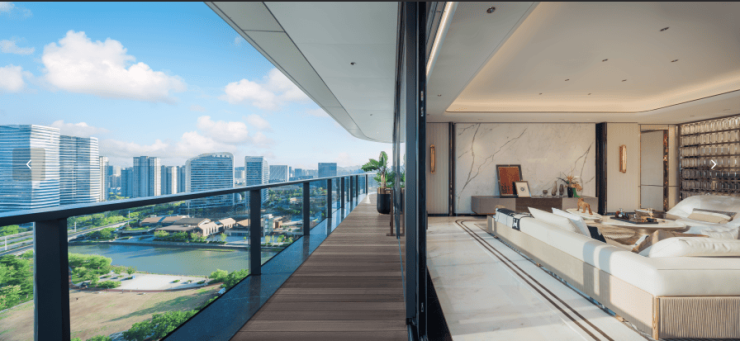 电动提升推拉门缓缓打开,1.8m宽100m长的跑道大阳台豁然眼前,每个房间都带阳台,毫无遮挡,望着楼下的公园河景,风是自由的,你也是。