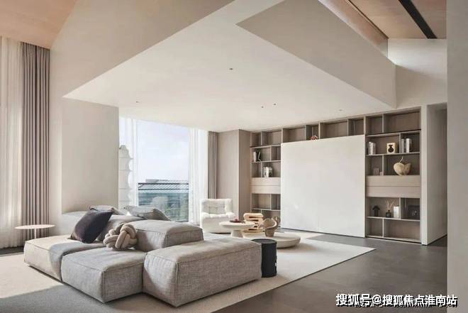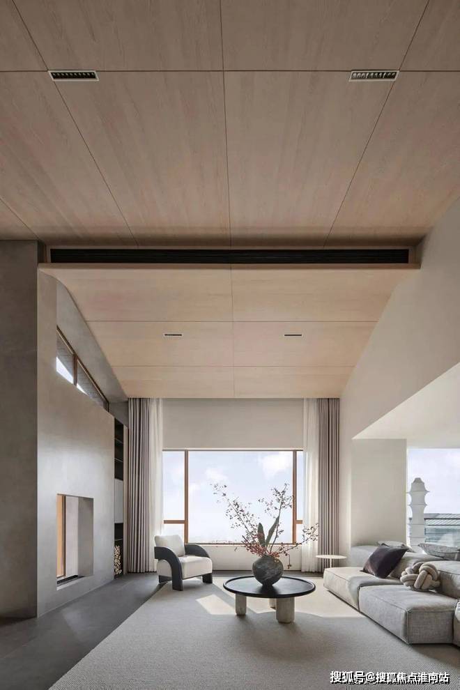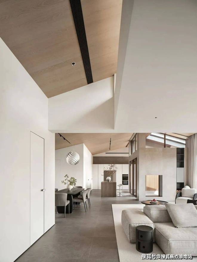 倾斜的吊顶和特意做出的错落 “断层”,增强了空间的纵深感。这种感觉不是来自单一方向,而是四面八方的张力共同形成的。