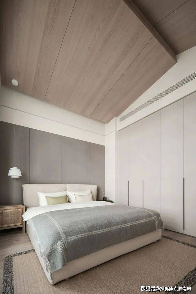次卧的设计比较简约,经典的色调让房间一直很温暖。独特的拼贴式吊顶设计解决了不规则的角度和边缘问题,空调出口也做了美化,不影响美观。一侧的背景墙里嵌入了衣柜,保证了实用性。整个空间有一种平静又永恒的美感,简约风格的魅力很明显。