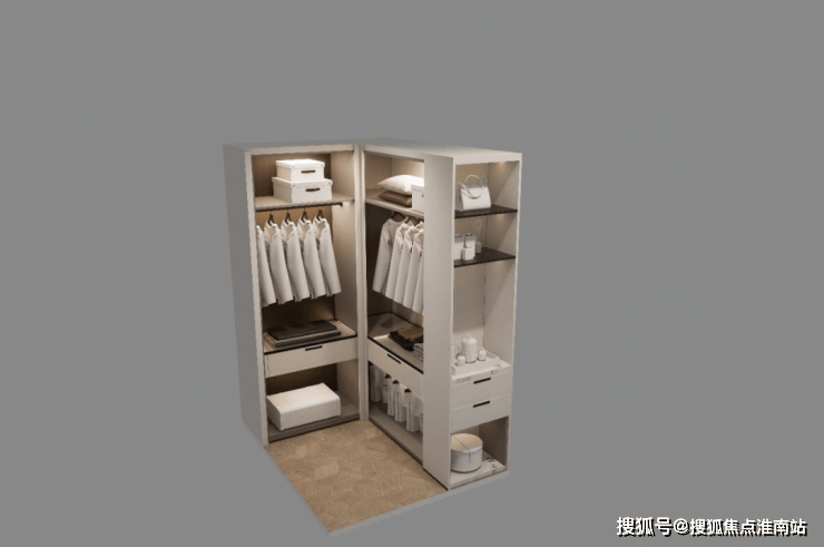 主卧和约99平户型一样,衣柜更大形成衣帽空间,还交付有半开放式、类似于酒店的迷你吧设计: