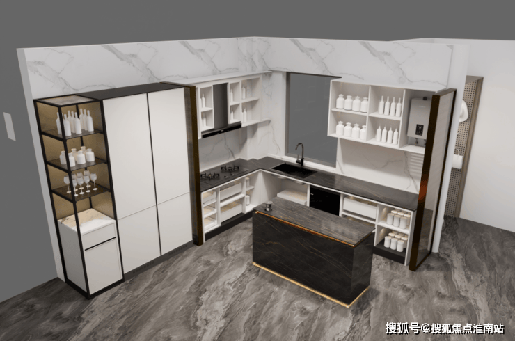 看到约143平户型,厨房岛台和上柜都不稀奇,厨房外的半开放式餐边柜和利勃海尔内嵌式同样也作为交付标准附赠,柜体额外提供接近1立方面积的收纳空间: