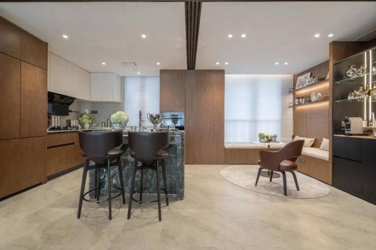 这处门庭采用贝金米黄石材、维多利亚绿、白雪公主奢石,结合古铜色金属板,形成冷暖撞色的张力美学,打开了城市奢度,每个细节透露出“贵”。