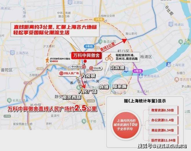 离传统市中心越近,资源密度越浓。中興傲舍离8号线中兴路站步行只有约400米,2站人民广场(直线距离约2.5公里),直线距离约3公里覆盖南京西路、静安寺、南京东路、陆家嘴等核心板块,中興傲舍与市中心资源深度绑定。