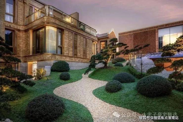 用昂贵的幻彩红奢石,把砖墙的直角做成了更优雅更昂贵的弧线圆角,与红砖形成了更丰富的肌理变化。精心镶嵌的金属线条,勾勒出了建筑的璀璨轮廓。入口处的弧形转角大幅落地玻璃窗,带来高奢酒店的氛围。站在街边,你已经可以看到庭院中的巍巍劲松探出一角,引发你步行归庭的情绪。