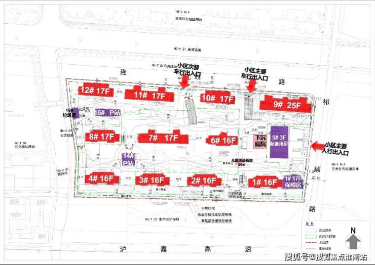 其中1号楼靠近17层的保障房,5号口为3层的配套用房;14#、15#为P站,16#为垃圾用房。