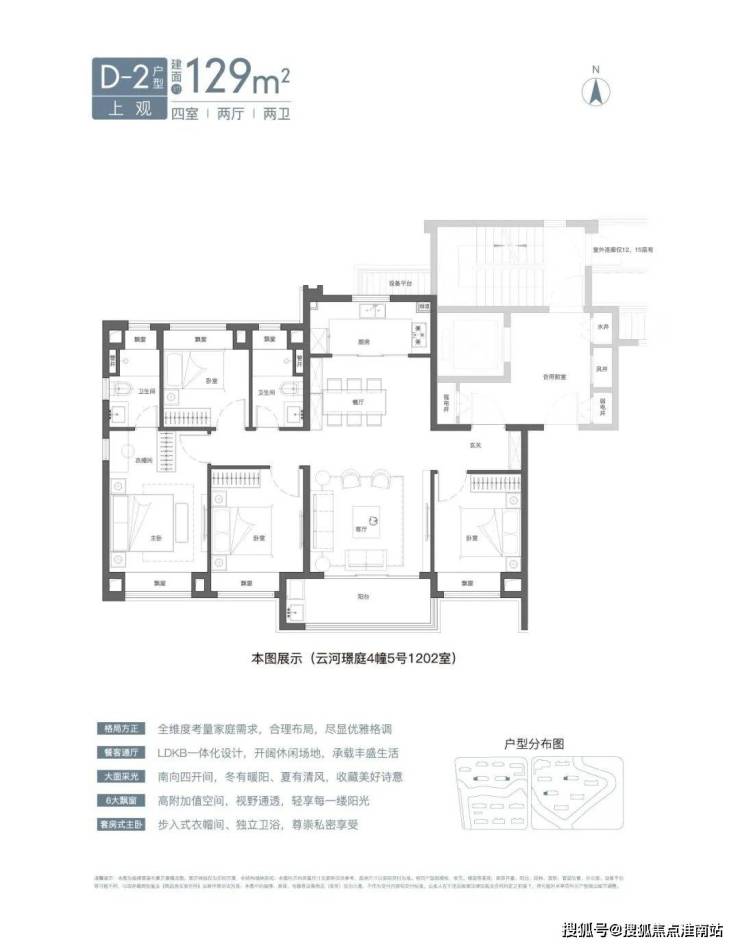 预算充足的小伙伴,可以选建面约129㎡4房,经典的三卧朝南、边套观景户型。