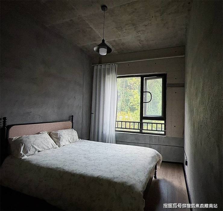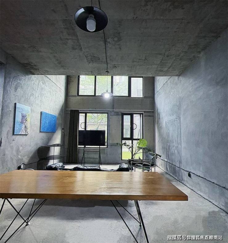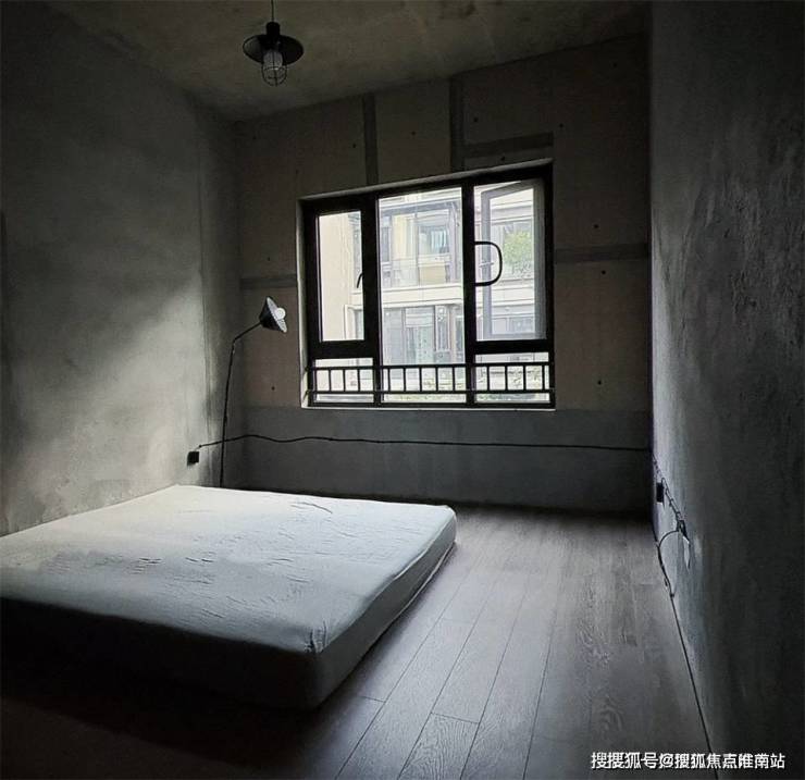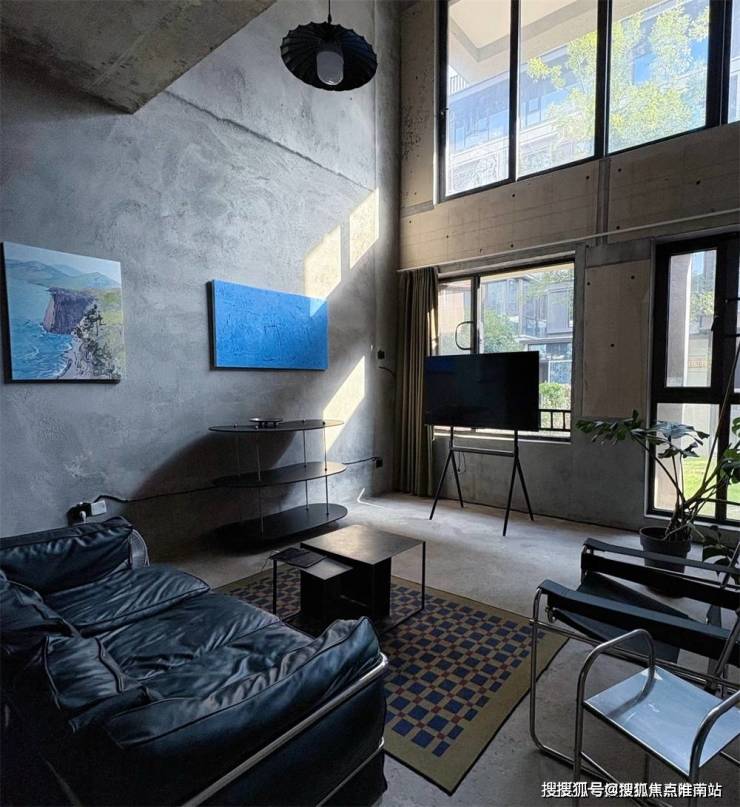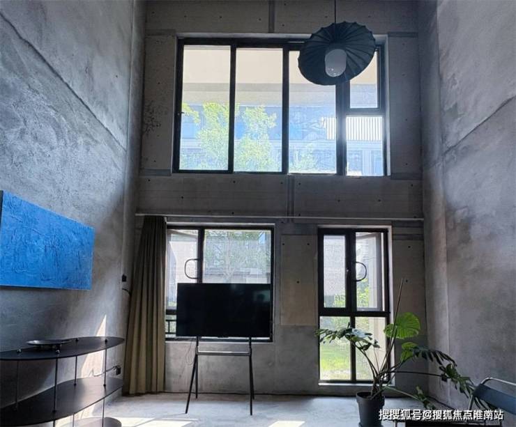 距离更远的窗户下方直接放支架电视,因为是一楼,窗外还有个小小的草坪院落,坐在沙发上望着窗外绿意盎然,仿佛屋内的毛坯房风格也不那么冰冷无趣了。